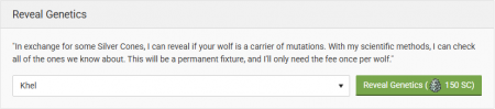 For the price of 50 Silver Cones per mutation, you can have Gene check a selected wolf for a specific mutation from the drop-down menu. This will only reveal if your wolf is a carrier for the chosen mutation rather than all of the available ones. Choosing a recessive mutation will then open up the drop-down to select a wolf to check for the specific mutation you're seeking.