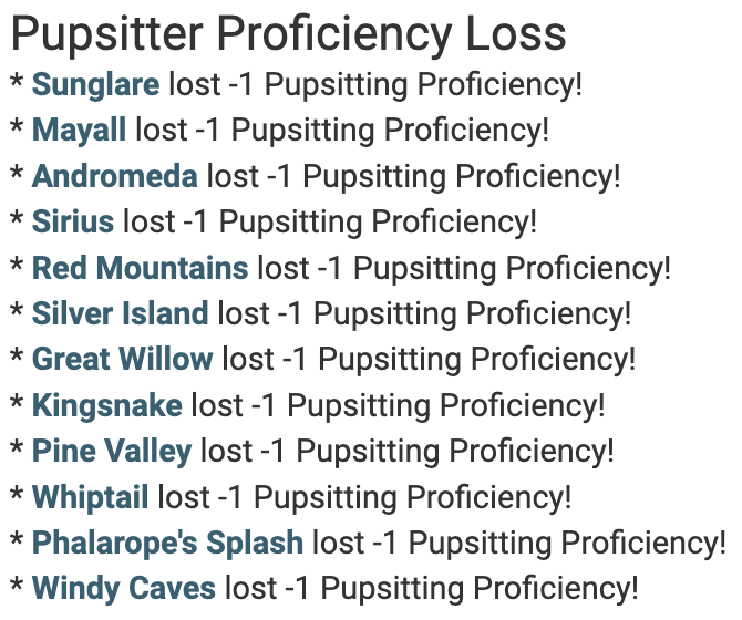 Wolves who are actively protecting puppies will gain 5 proficiency points every rollover as well as a small amount of EXP. Every rollover they are not actively protecting puppies, they will lose 1 proficiency point until they are completely out. Even if you change a wolf's role, they will still maintain their previous pupsitter proficiency. So, if you switch a pupsitter with 75% proficiency into the hunter role, and then switch them back to pupsitter, they will still have proficiency in pupsitting, though they will have lost some proficiency depending on how many rollovers they were not protecting puppies. Pupsitting proficiency losses are listed in your Daily Rollover Summary.