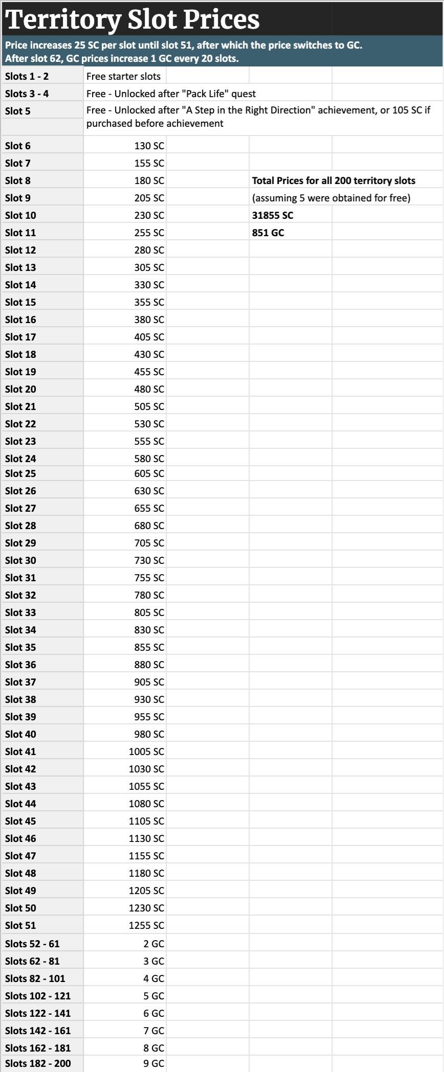 The table below lists the prices for every territory slot as well as how much currency is required to purchase all 200. You can also view the table here.