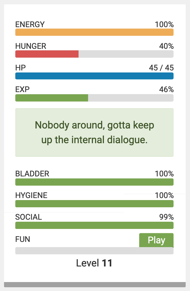Clicking on the button to restore each need would generate a random flavor text from the below possibilities.