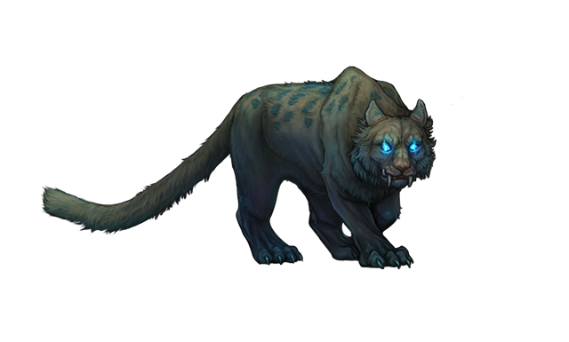 A nearby moss-covered log starts to move, and you realise that it never was a log–it's a large cat. Its fur is green and blue, and blends in well with its surroundings.