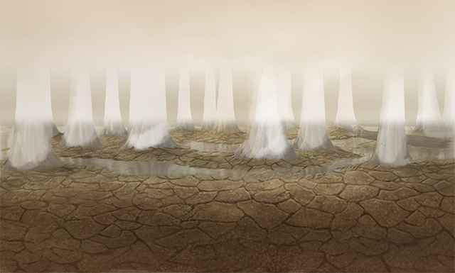 New warning icons will begin appearing in the biomes you've fully scouted to represent disasters, weather events which affect what you can find in each biome. There are two categories of disaster. Disasters are the basic and most frequent weather event, involving a more moderate storm or event. If taking a turn for the worst, a disaster can develop into a cataclysm, a stronger, more catastrophic event that brings great peril to the region.