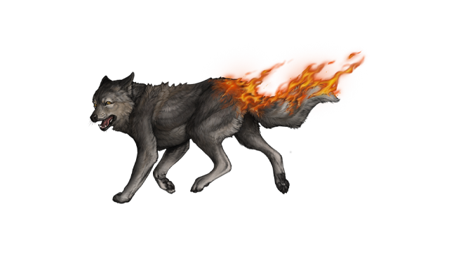 A loud, painful whine can be heard long before you lay eyes on the source of the sound. A panicked wolf appears from nowhere, running forward with its mind fogged by fear and shock. The fur on its rump and tail is on fire, leaving a rain of sparks behind it.