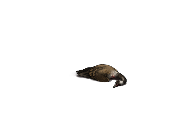 A dead goose lays out in the open, its feathered body ruffled and nearly unmarked. You sniff it curiously, searching for any sign that a predator is nearby. You only smell the stench of death, and there's no bite marks at all. Did it fall from the sky? You notice the neck is twisted at an odd angle, and wonder if that was the cause of its demise.