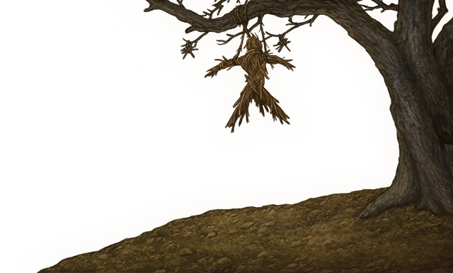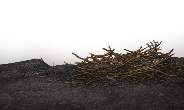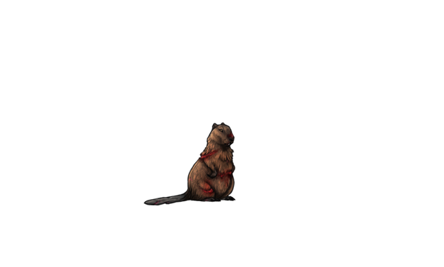 A grisly sight greets you as you explore the area following the disaster. A muskrat hangs from a freshly splintered stump, impaled by a sharp branch at the end. It seems like the muskrat was caught up at the wrong moment like so many other animals.