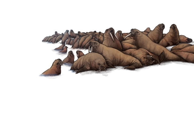 | Loud noises, a nasty smell, and aggressive thumping give away the fact that you're approaching a massive walrus herd. | ||