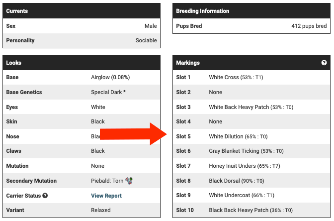 Each wolf can have up to 10 markings, and they don't necessarily have to be unique. You can find your wolf's marking details on their page under the Markings section, where each marking is separated into a slot. Higher slots appear above lower slots in the wolf's art. That is, Slot 10 will be on the top and Slot 1 will be on the bottom. If the wolf does not have a marking in a specific slot, it will display as "None". Markings in one slot will have no effect on markings in other slots, each is a separate trait. In breeding, only markings in the same slot as each other will interact.