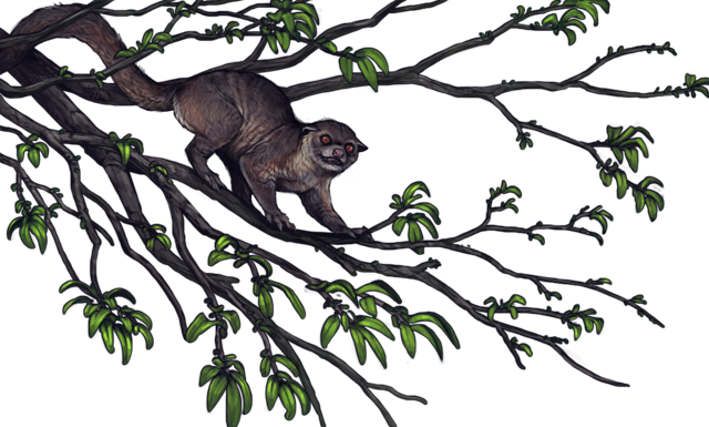 What a strange looking creature! Its fur looks soft to the touch. It peers down at you curiously from the branches, wary but not afraid.
