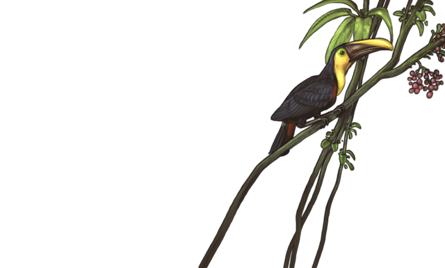 Shake the branch You jump and grab the branch with your mighty jaws! As you thrash your body around, something falls down from the branch! +1 Toucan Feather