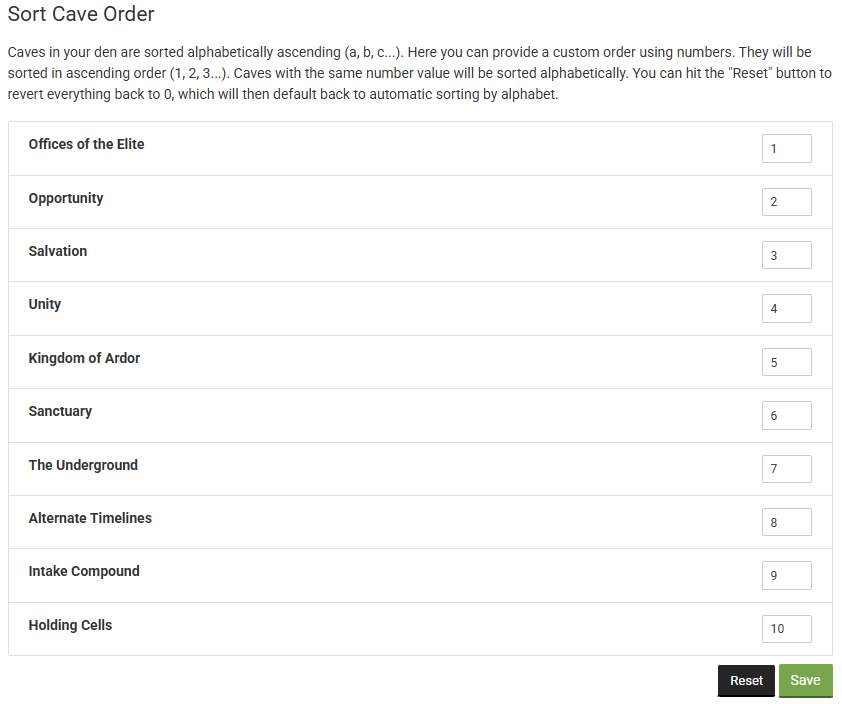 Caves in your den are sorted alphabetically ascending (a, b, c...). Here you can provide a custom order using numbers. They will be sorted in ascending order (1, 2, 3...). Caves with the same number value will be sorted alphabetically. You can hit the "Reset" button to revert everything back to 0, which will then default back to automatic sorting by alphabet.