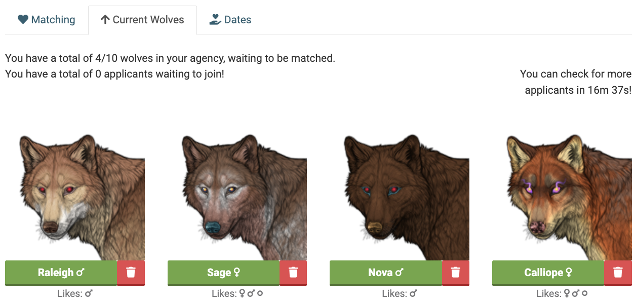 Upon visiting the Matchmaking page, you'll find three tabs. The Matching tab is where you can set up dates between wolves in your agency. The Current Wolves tab is where you can view all of the wolves you currently have in your agency. Finally, the Dates tab is where you can view any of the active dates you've sent out.