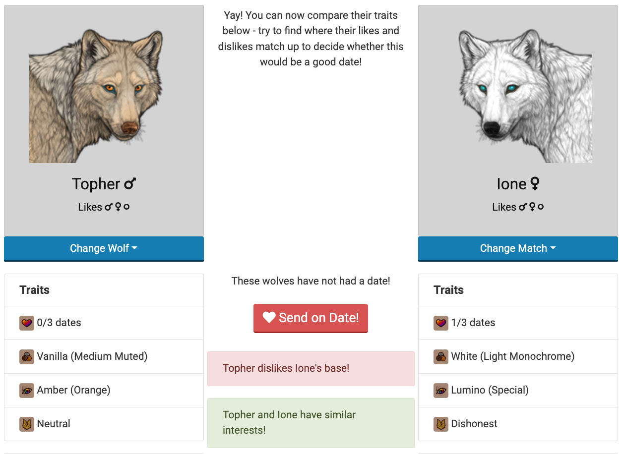 When setting up a date between two wolves, the goal is to pair wolves with the most likes in most compatibility between traits. On the [Matching] page, you can select a wolf from the first dropdown menu to view all of their traits and preferences.