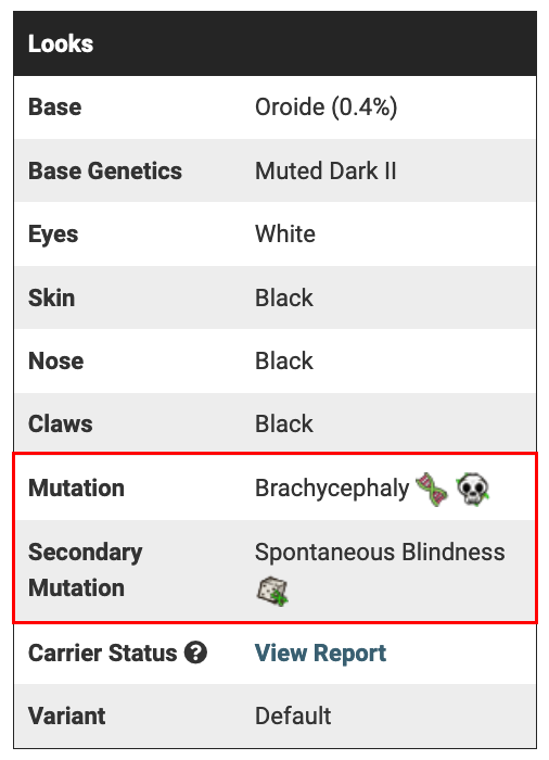 When a wolf has a mutation, you will be able to view that mutation's categories on the wolf's page under the Mutation or Secondary Mutation fields. Each category will display a different icon.