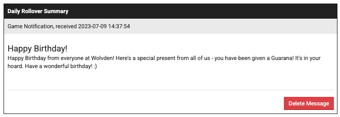 Rolling over on your birthday will grant you one Guarana, automatically received after your rollover! You can find the message informing you of this gift in your Daily Rollover Summary. This gift cannot be traded to other players, as it is bound to your account. You must rollover on the exact date of birth tied to your account-rolling over before or after this date will not grant you a Guarana.