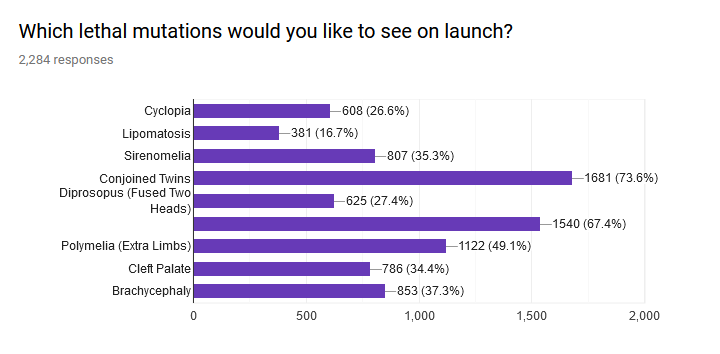 A poll is put out regarding lethal mutations! All mutations in the poll will be released at one point, but followers voted on which they wanted to see first. Of this poll, the winners, Conjoined Twins, Polymelia, Polycephaly, and Brachycephaly, were the first lethal mutations in game. Sirenomelia, another poll option, was released at the end of 2023.